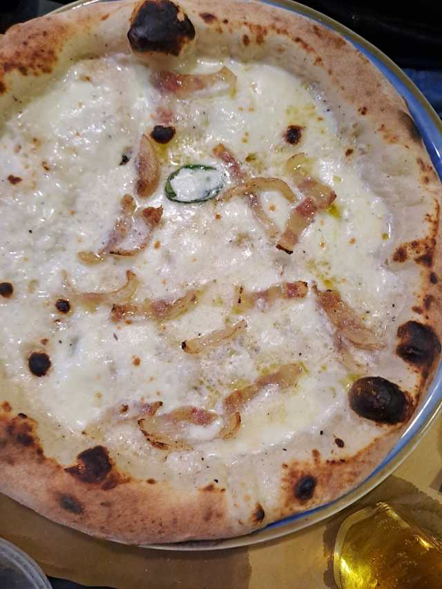 - Crema cacio e pepe, mozzarella, guanciale, olio EVO