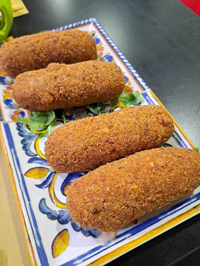 - Crocchetta di patate a pasta gialla/ viola, ripiena di mozzarella filante e servita con crema cacio e pepe e zucca