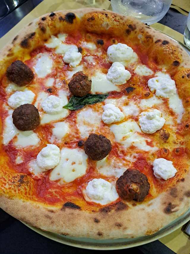 - Sugo di pomodoro, mozzarella, basilico, polpette fatte in casa, nuvole di ricotta