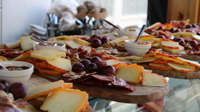 Queijos, enchidos, presunto, uvas, doce de abóbora e noz