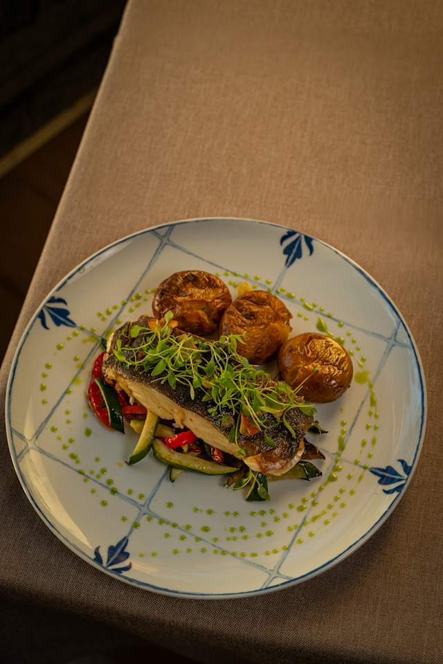 Seabass fillet with creamy Portuguese corn grits " Xerém" & herb foam