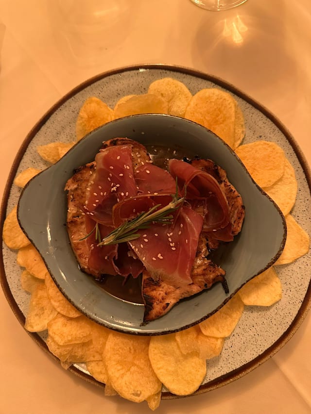 Tamboril e salmão no espeto acompanhados por batata marinada e legumes salteados