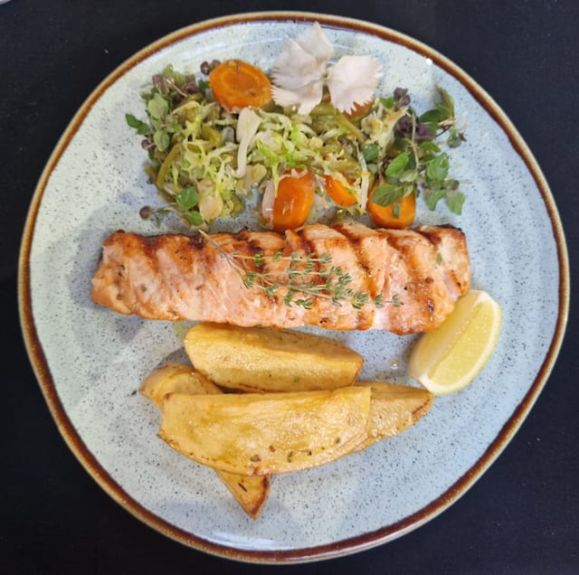 Lombo de salmão acompanhado por batata marinada e legumes salteados