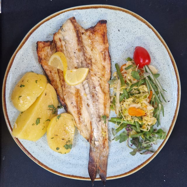 Sardinhas assadas acompanhadas por salada de pimentos e batata marinada
