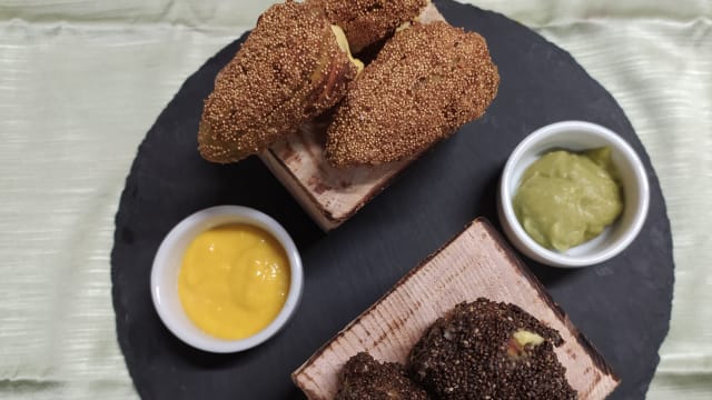 Cotoletta di sedano rapa con maionese alla rucola mousse di melanzane, crema di caprino e sfere di balsamico