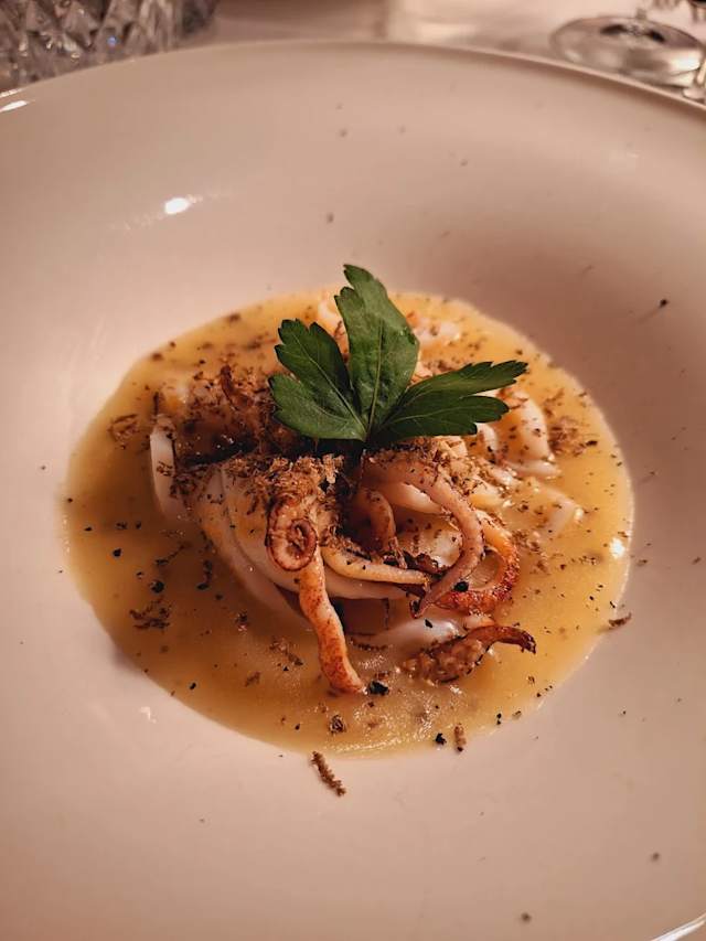 - Ravioli di zucca con burro e salvia, castagne e calamari alla brace