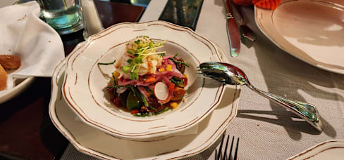 5.5/10The food was good, but in our opinion too expensive for the Qualität. What really dissapointed us was, that they had an absolutely horrible playback-musician who played the whole evening. It was basically impossible to make conversation due to the noise level..