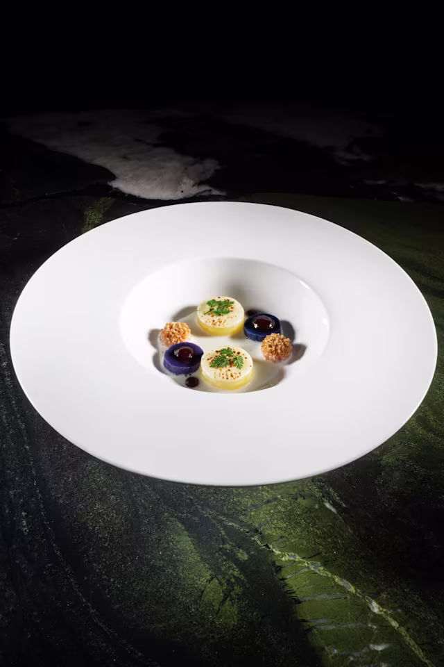 - Ricciola marinata alla salvia, ceviche di pera e perle di tapioca all’aneto