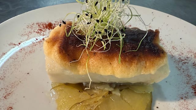 Bacallà d’islàndia gratinat amb mussolina d’allioli i patates confitades