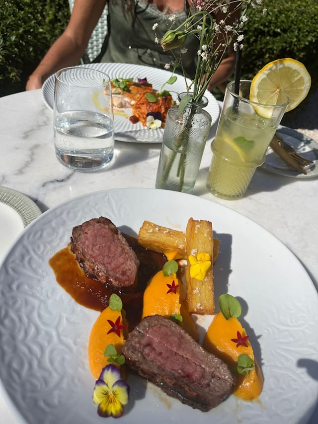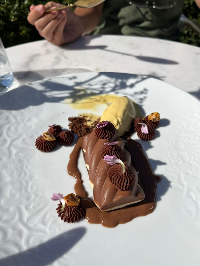 8.5/10😊 Nice decoration. I had a very nice space for my dog and I as it rained and I could not sit outside as planned. 😐 The menu was 200€ and definitively overrated. I ate better in other 2 Michelin ⭐️ restaurants (even in 1 Michelin ⭐️ restaurants) 😕 I got a glass of champaign for 33€ with barely any bubbles😳 (open bottle). Anyway, they took it back.