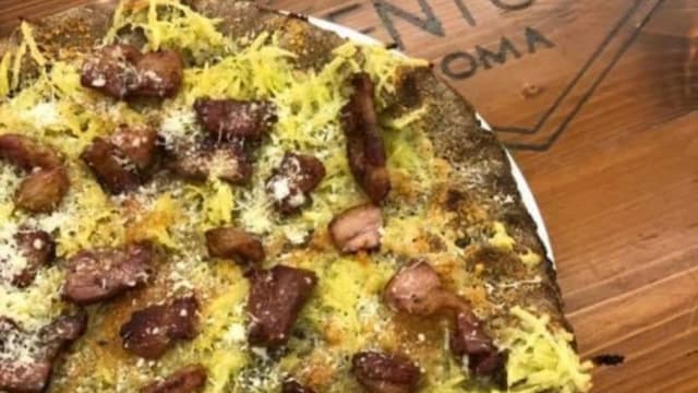- Burger di manzo 200 g, bacon, croccante, fonduta di formaggi, pomodoro, lattuga, mayo