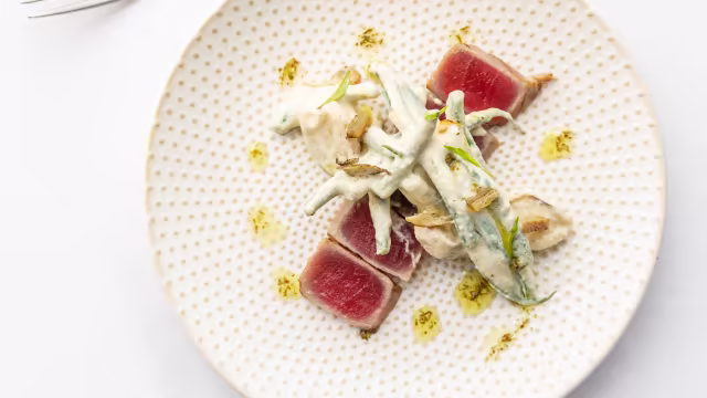 - Coca de lengua de ternera, salsa tártara y acelgas