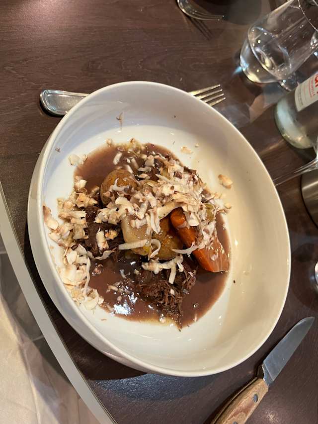 - Bœuf bourguignon, pommes de terre grenaille