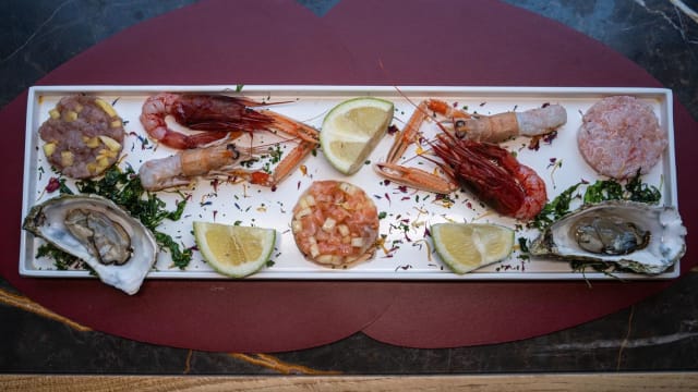 2 ostriche, 2 scampi del Mediterraneo, 2 gamberi di Mazara (1° scelta), 3 tartare in base al fresco di giornata