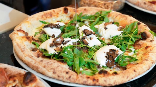 Burrata pugliese acompañada con rúcula, tomate seco, aceituna kalamata, pasas, piñones, con pesto genovese.
