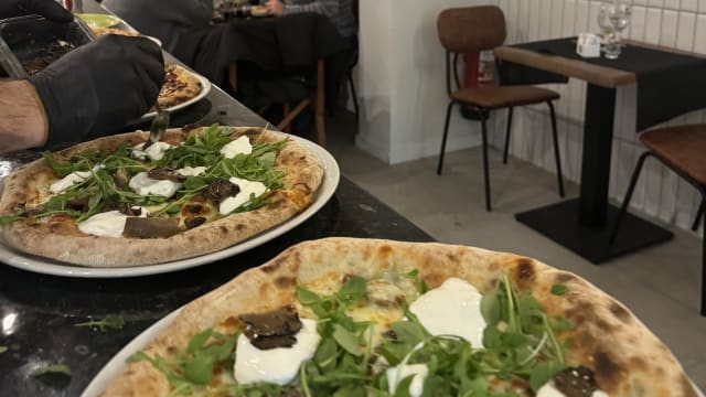 Con crema de setas porcini, setas frescas variadas, parmesano y escamas de trufa negra.