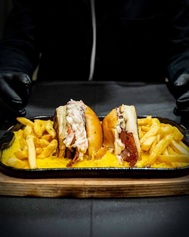 - Pulled pork, fonduta cheddar, wurstel in salsa rosa e patatine