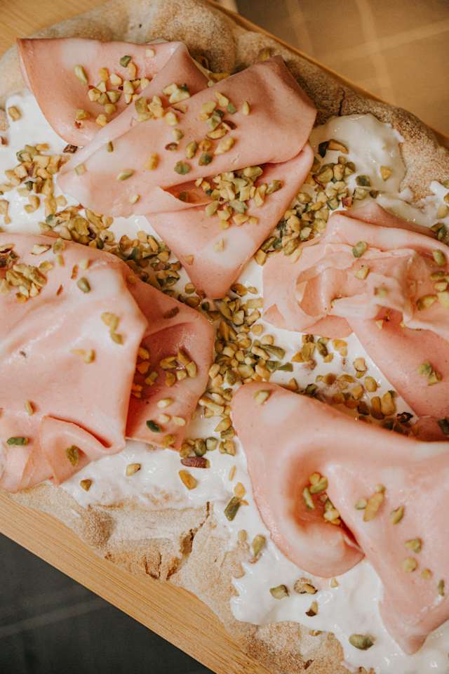 - Pinsa gustosa (mortadella, stracciatella, granella di pistacchio)