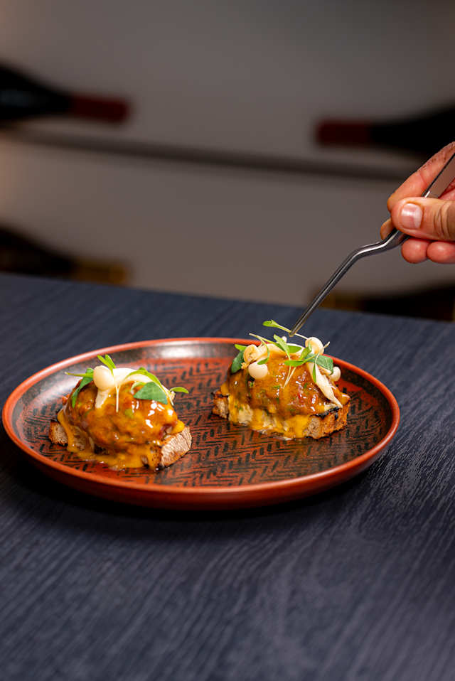 - Pica pau de pato, laranja em puré e pickle, molho do pica pau e tostas de pão brioche.