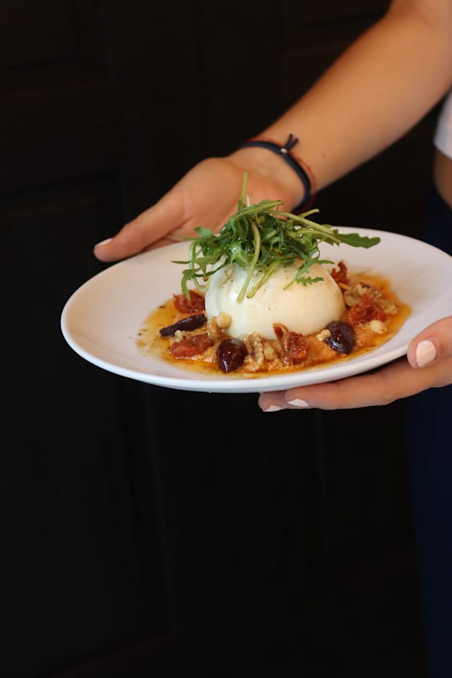 - Burrata, pesto de tomates secos, aceitunas kalamata y rúcula