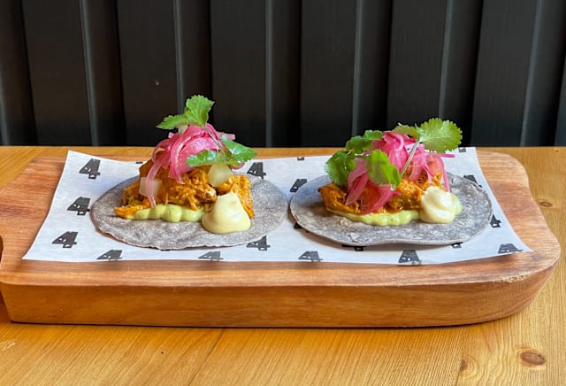 - Taco de cochinita pibil, aguacate, piña y mayonesa acevichada. 2ud.