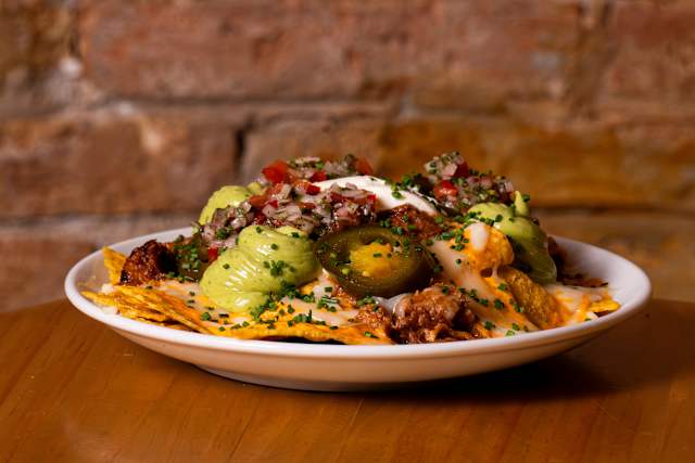 - Nachos completos con guacamole, pico de gallo, queso, jalapeños y cochinita pibil