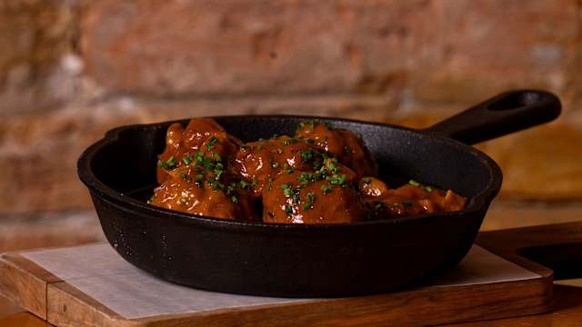 - Carrillera de vaca estofada al vino tinto con parmentier de patata y parmesano