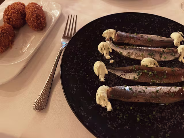 - Lasques de bacallà fumat amb olives kalamata, ceba cruixent i cansalada ibèrica amb tocs d’allioli negre