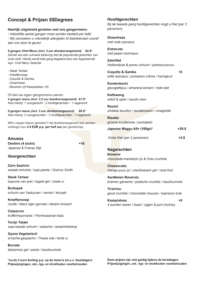 55Degrees is located in the beautiful monumental building at the Jansplein in Arnhem. Classic on the outside and contemporary on the inside. Our inspiration comes from classic French and modern Japanese cuisine. With this fusion, we create unique and surprising dishes. Our collection of wines is se...
