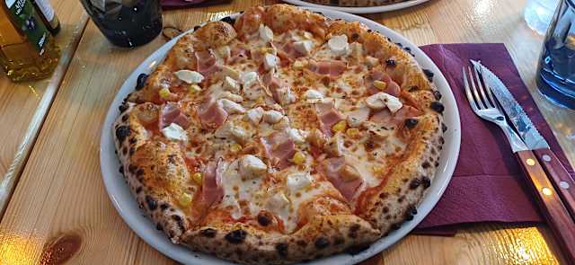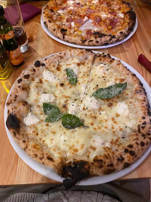 - Tomate san marzano DOP, fior di latte, frango, cogumelos, milho, orégãos
