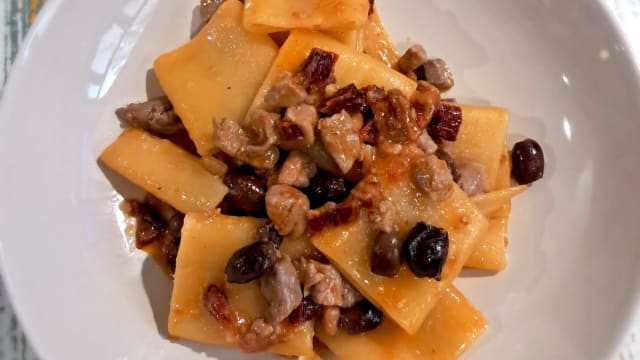 Pomodoro, salsiccia di fegato, cipolla rossa e scaglie di grana
