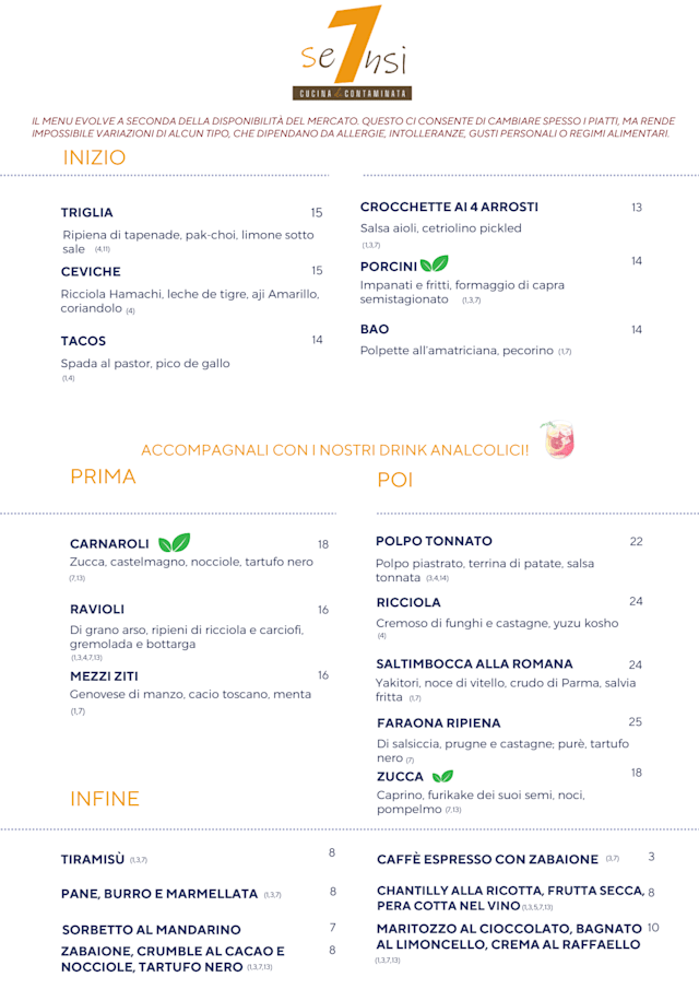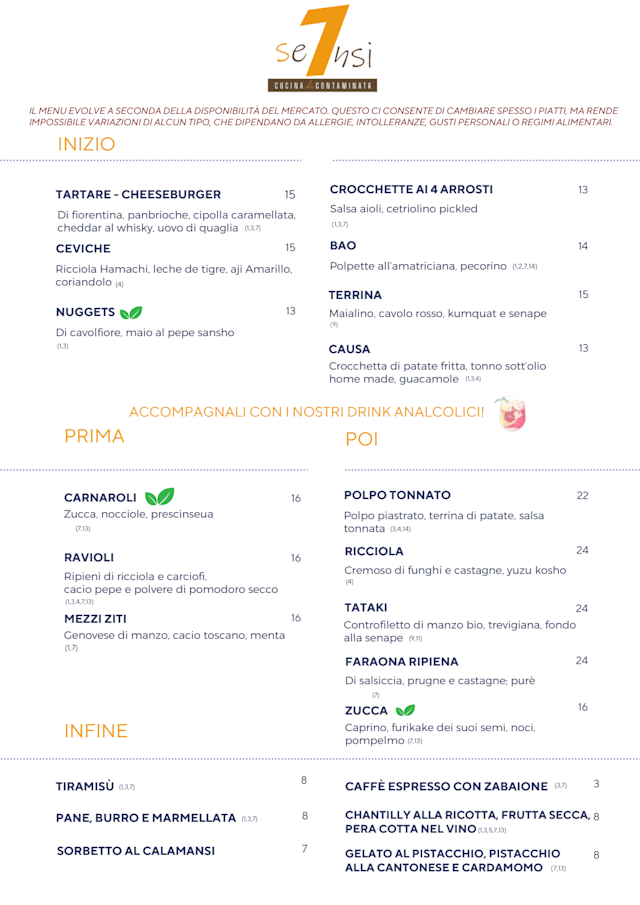 10/10We had a superb meal at 7 Sensi Cucina Decontaminata tonight! The offering was a tasting menu tonight. The courses were all interesting and very flavorful. The service was kind and supportive without being intrusive. The kitchen is behind glass so that the staff is visible. It is fun to see them at work. Plus it is obvious that they enjoy what they are doing. Let me go back to the food - it was very good and I will highlight two of them. Tuna with watermelon and chorizo and peach was light and flavorful with just the right combinations of sweet and umami, interesting texture and taste. The dessert was a lovely deconstructed and reconstructed twist on bread and chocolate - and just perfect! I don’t know why they don’t have a sold out sign every night. If I lived her I would be a frequent visitor.
