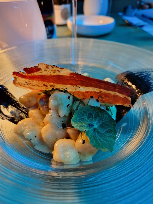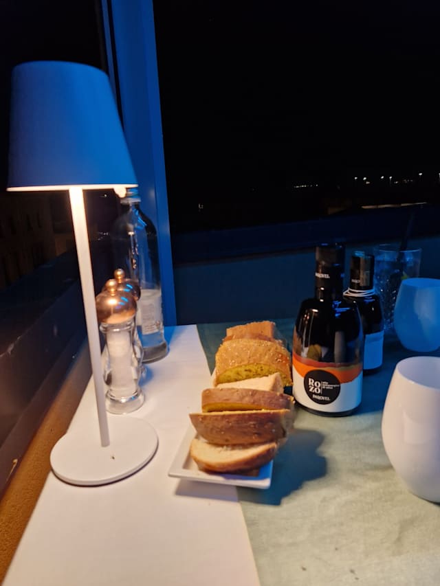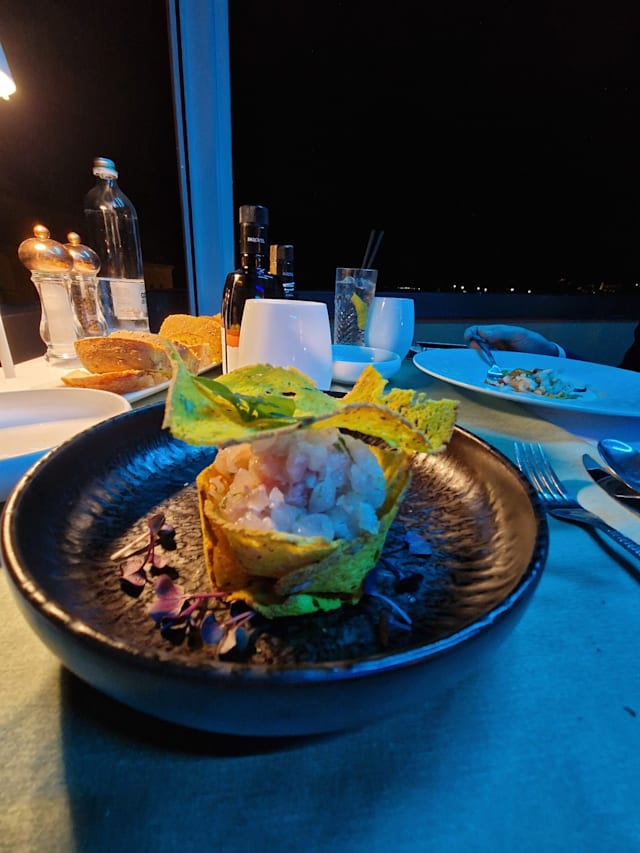 9.5/10Yesterday we enjoyed a freash and healthy full dinner. For each plate you could choose out of three options (meat, fish or vegitarian). The plates were delicious, and the cook knows how to dress up his/her plates! We were surprised with an amuse bouche. The waitress was very kind. She spoke English very well. She had a lot of patience and gave good advice in the choice of wine. Last but not least we enjoyed the beautiful skyline and admired the sunset at sea.