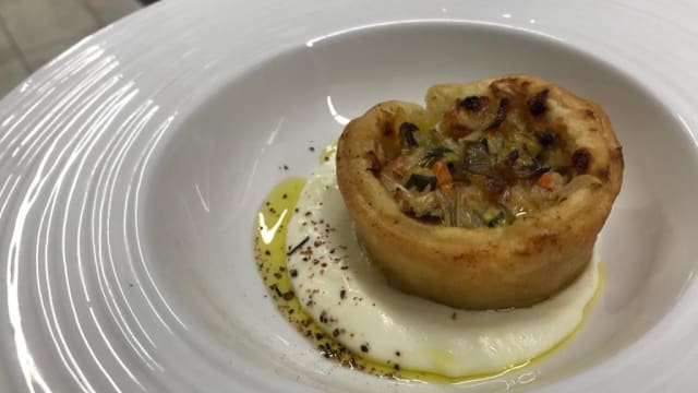 Tortino di pasta sfoglia con carciofi e bacon su crema di patate allo zafferano