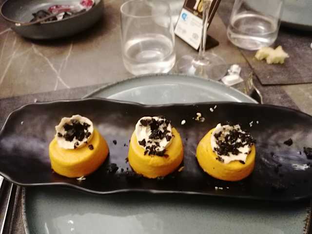 - Tipo cannolo, con ricotta della murgia materana al profumo di limone e pistacchi, unto di riduzione di cotto di fichi senza zucchero.