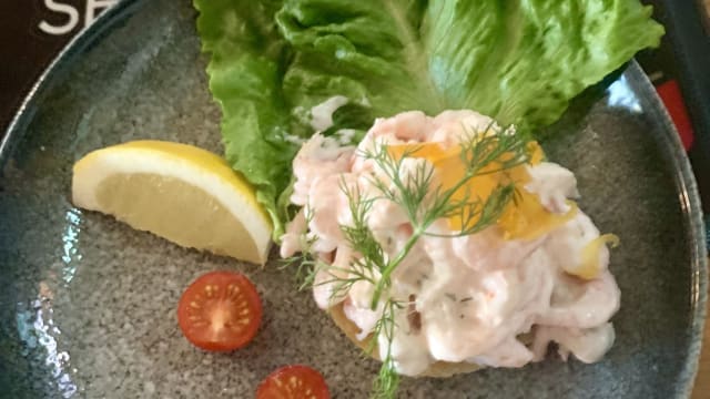 Klassisk skagenröra på handskalade räkor, majonnäs, kryddor, citron och dill samt smörstekt bröd