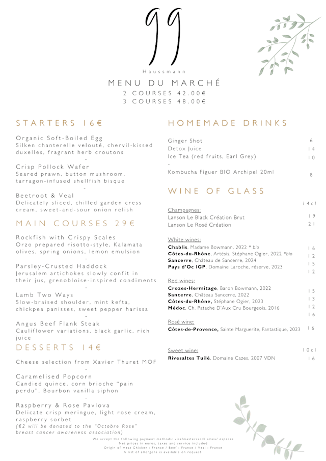 FrenchEuropeanBrunchCreativeFine DiningFrom marketOrganicGluten freeLactose intoleranceLocally producedNut allergiesPeanut allergyVegan dishesVegetarian dishesAmerican ExpressChildren's menuWifi