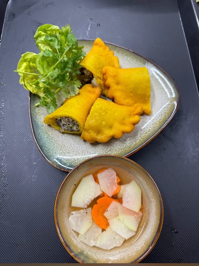 Una delicada masa crujiente rellena de tierno cerdo marinado, huevo y verduras frescas, frita suavemente hasta alcanzar un dorado perfecto. Un equilibrio armonioso de textura y sabor inspirado en la cocina tradicional vietnamita.