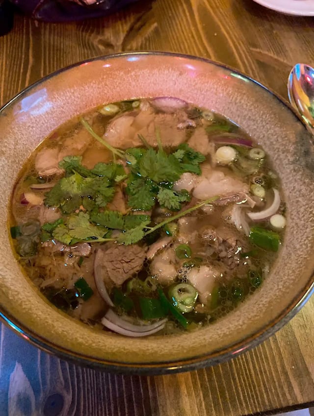 Fideos de arroz con tierna carne de res, salchichas vietnamitas y albóndigas de carne, hierbas frescas y un toque de lemongrass. Cada cucharada ofrece un equilibrio perfecto de sabores intensos y aromáticos, evocando las tradiciones culinarias de la antigua capital de vietnam.
