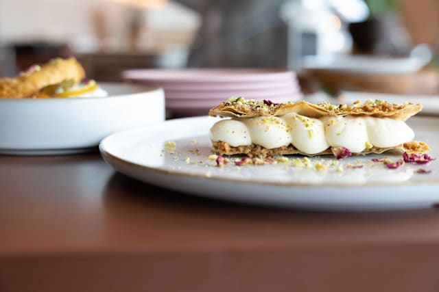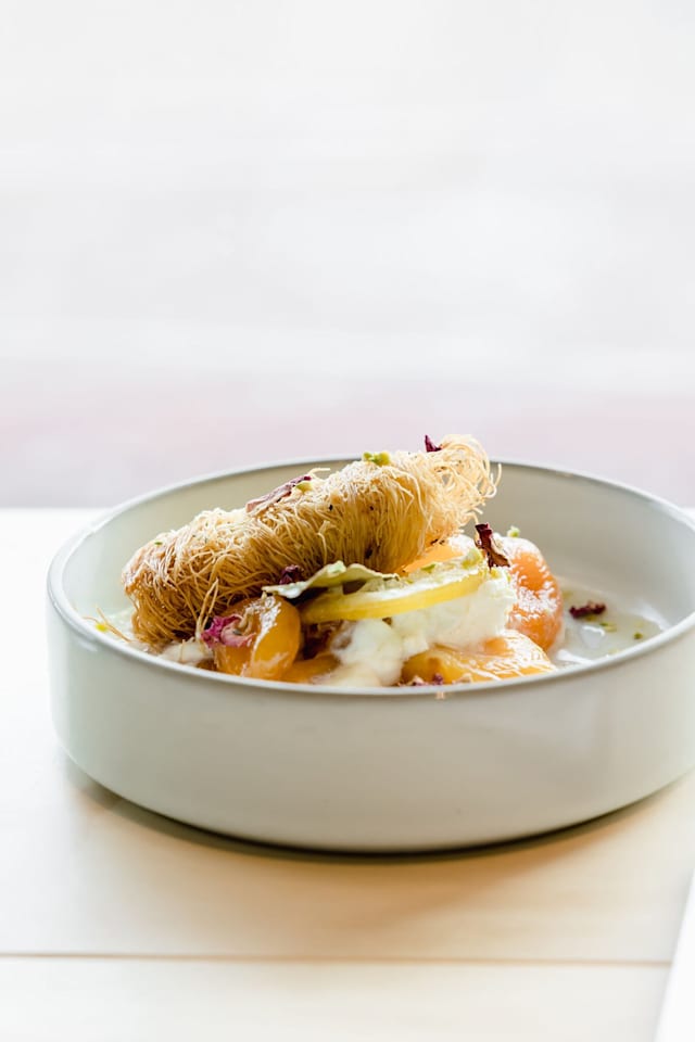 With yoghurt foam, kataifi and cardamom syrup