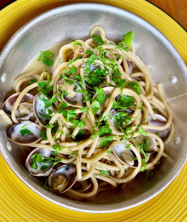 - Pasta con ajo, anchoas, almejas e perejil