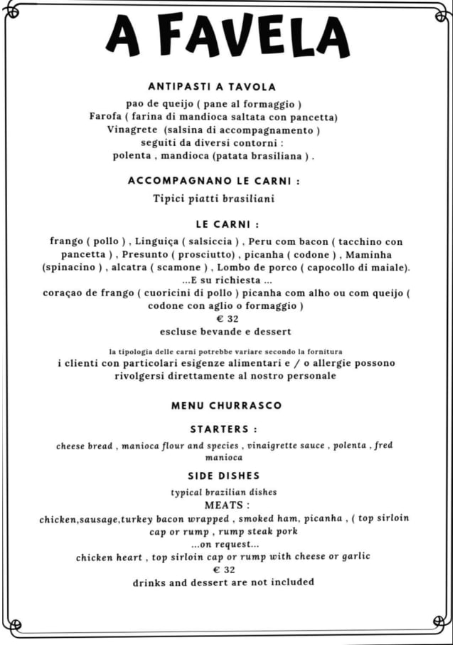 10/10Very good food. I loved the "Feijoada, feijao tropeiro e farofa. Good meat service at the" rodizio". Well made Caipirinha cocktail. I paid for 3 caipirinhas, 4 glasses of wine and 2 rodizios menu. €100. It was a fair price. I would go back.