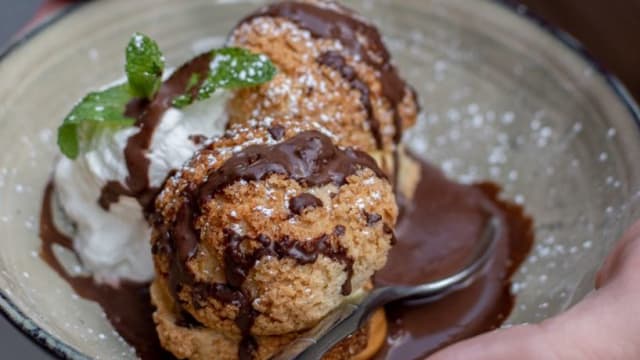 Profiteroles, glace vanille, sauce chocolat et chantilly