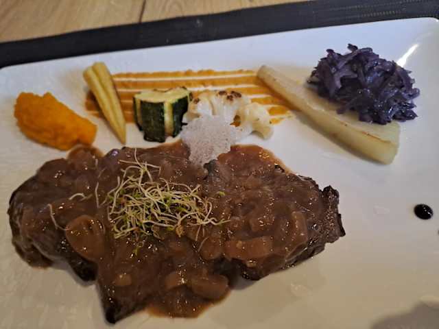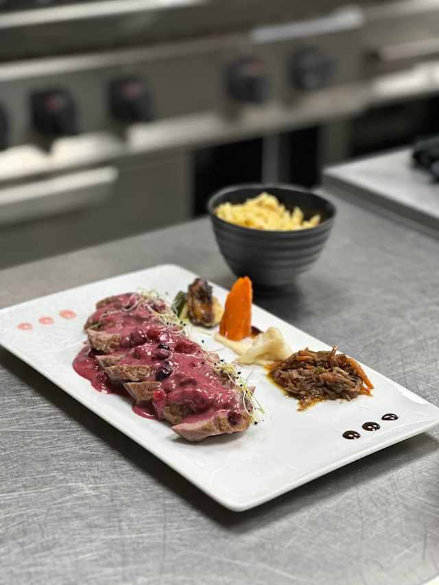 - Sur son coulis aux fruits rouges, accompagné de légumes sautés et spätzles