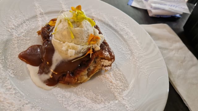 - (Brioche corse aux noix et raisins secs) façon pain perdu, glace vanille, sauce caramel