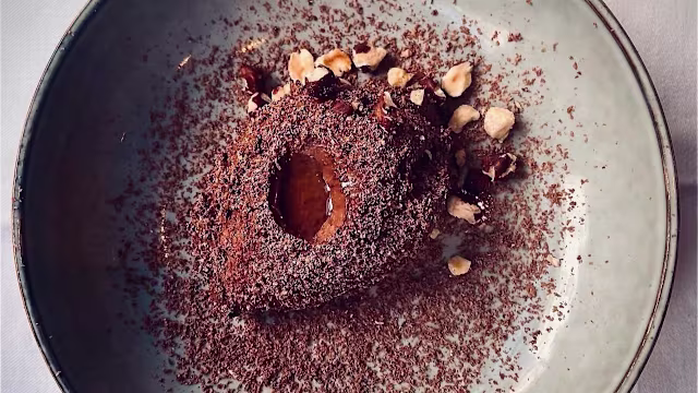 - Mousse au chocolat à l'huile d'olive et sa rappe de chocolat, concassée de noisettes