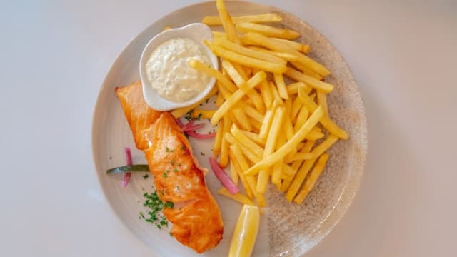 Pavé de saumon frais grillé servi avec légumes de saison.