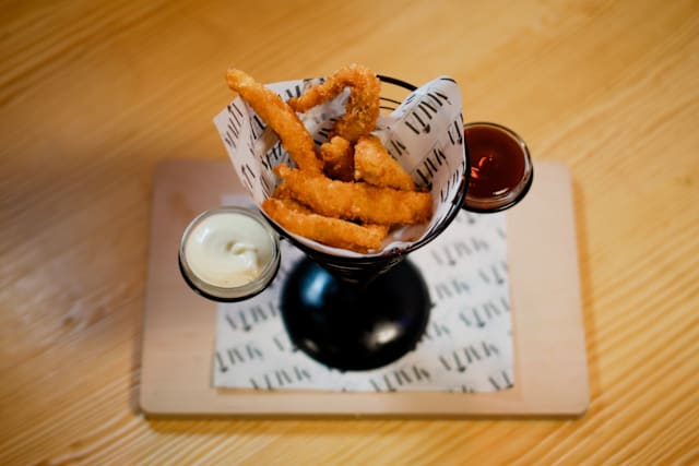6 Suculentas tiras de peito de frango, panadas e fritas, douradas e crocantes. Perfeitas para partilhar ou para quem não resiste ao clássico sabor do frango no ponto certo, acompanhado dos nossos molhos especiais: rosê e maionese de alho.