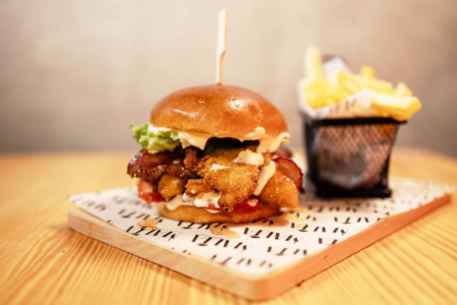 Hambúrguer no pão com maionese de alho, cheddar, bacon, alface e tomate. Acompanhado de batatas fritas.
