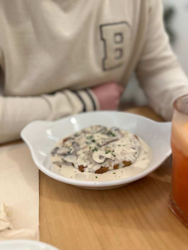 - Um creme saboroso com alho francês, alga e cogumelos pleurotus, com batata e bechamel caseiro. Acompanhado de salada.
